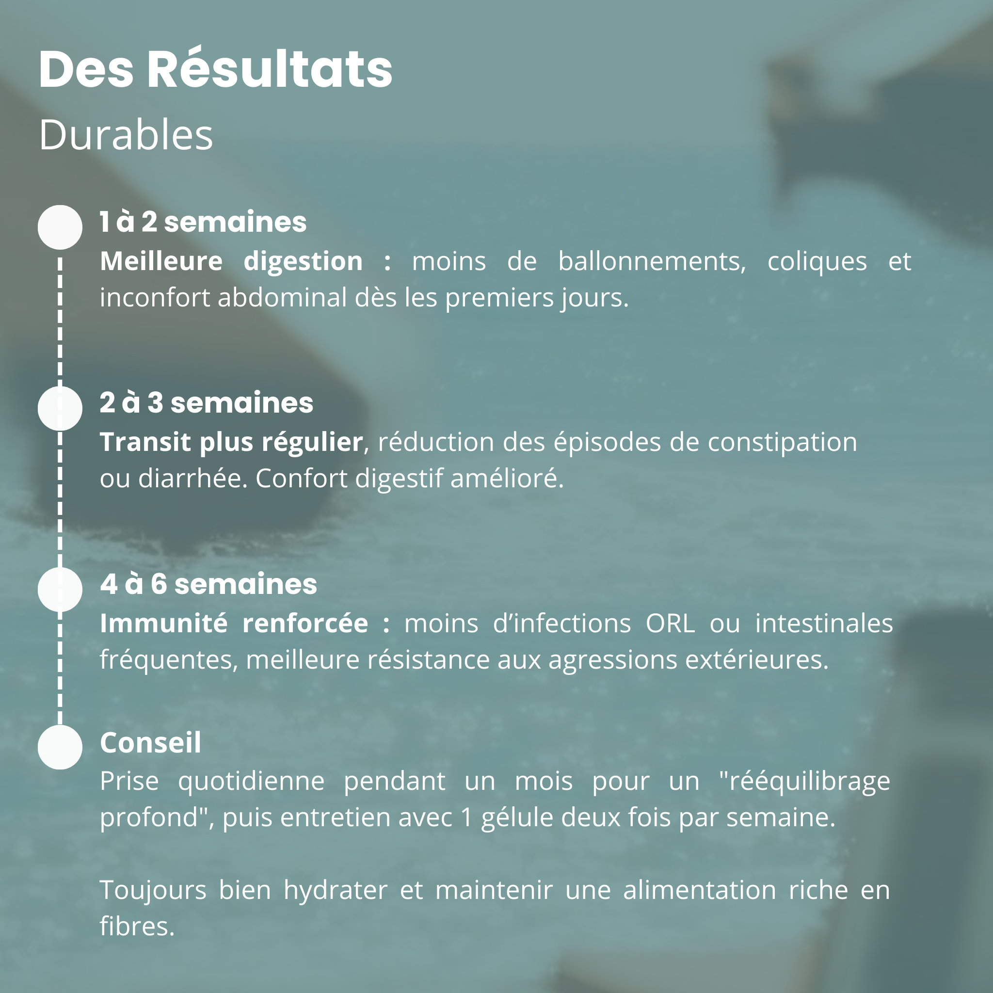 Après 2 à 4 semaines : Meilleure régularité du transit intestinal et renforcement du système immunitaire, avec une réduction des infections ORL et gastro-intestinales.