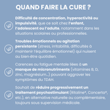 Cette formule est adaptée aux personnes qui ne veulent pas passer par des médicaments contenant de la méthylphénidate ou pour ceux qui en prennent mais souhaitent diminuer les doses.